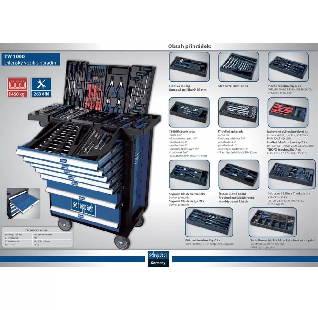 Dílenský vozík s 263 ks nářadí Scheppach TW 1000