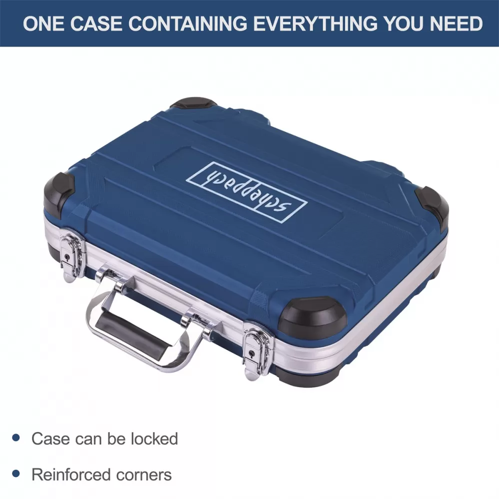 Scheppach TB 170 je velmi bohatá sada nejpotřebnějšího nářadí pro většinu prací spojených se šroubováním (135 ks bitů, klíčů, ořechů, ráčen) ukrytá v robustním hliníkovém kufru. Každý kus nářadí má přesně stanovené místo a bude tak vždy a rychle po ruce. I díky svým rozměrům kufr nezabere moc místa, dá se pomocí přezek pevně uzavřít a můžete ho snadno přenést na místo, kde budete nářadí potřebovat. Nářadí bylo vyvinuto tak, aby kvalitativně překračovalo běžné standardy v tomto cenovém segmentu. Kvalitní slitina Cr-V (chrom-vanadium) a hroty bitů ze slitiny oceli S2, jakostní plast na rukojetích i pogumované protiskluzové zóny zaručí, že Vám bude nářadí sloužit po mnoho let. A znalci zase ocení jemný design zubů ráčny umožňující malý zpětný úhel pohybu o 5° a tvar, díky kterému můžete vyvinout větší sílu (ke kontaktu se šroubem dochází v první třetině šestihranu, ne na koncích) bez poničení šroubu.