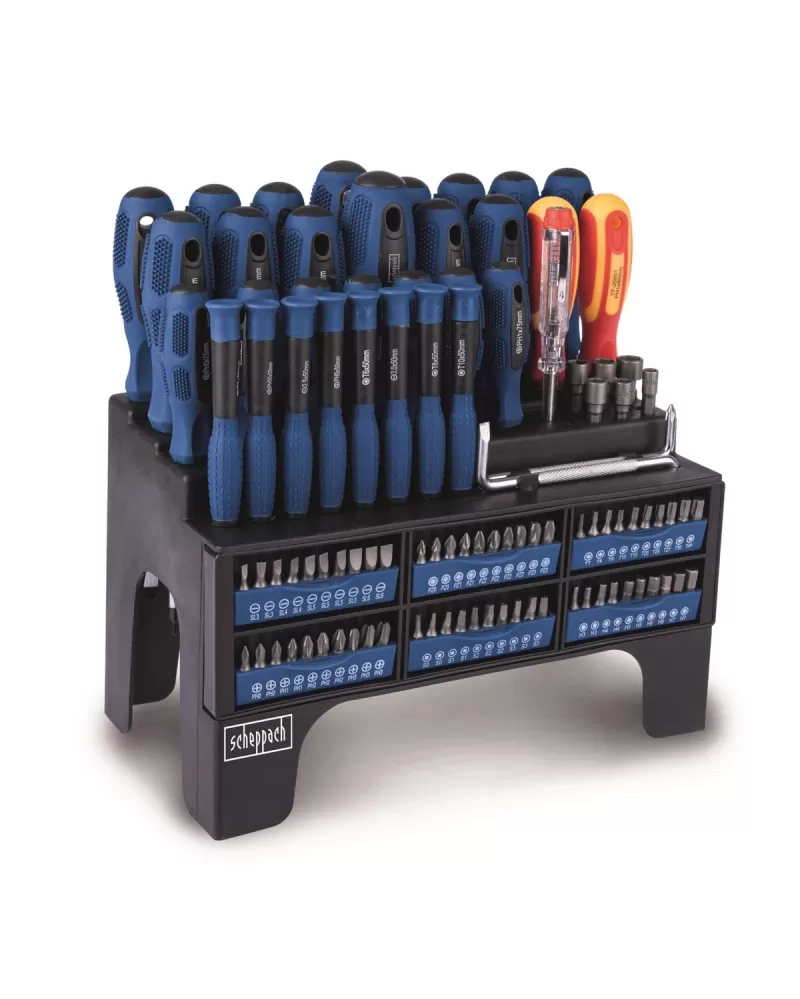 Scheppach SDB 100-2 je velmi bohatá sada kvalitních šroubováků, bitů a nástavců ukrytá v praktickém stabilním stojanu. Každý kus nářadí má přesně stanovené místo a bude tak vždy a rychle po ruce. Sada obsahuje i izolované šroubováky a zkoušečku napětí pro elektrikářské práce. Díky svým rozměrům stojan nezabere moc místa. Kvalitní slitina Cr-V (chrom-vanadium), magnetické hroty, jakostní plast na rukojetích i pogumované protiskluzové zóny zaručí, že Vám bude nářadí sloužit po mnoho let. Stojan se dá v případě potřeby rovněž připevnit na zeď.