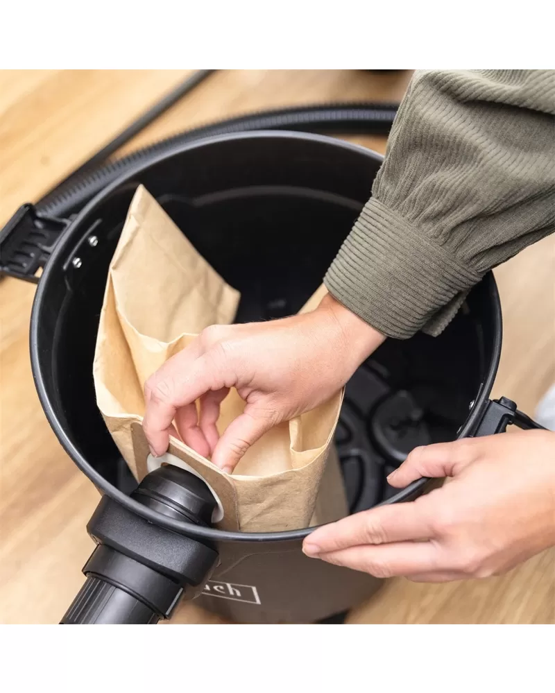 • Odolná, nerozbitná plastová nádoba o objemu 16 litrů je vybavena praktickým rychloupínacím zámkem, který umožňuje snadnou výměnu sáčku. Velký pracovní dosah zajišťuje třímetrový napájecí kabel a 1,8 m dlouhá hadice, takže se pohodlně dostanete i do vzdálenějších koutů.