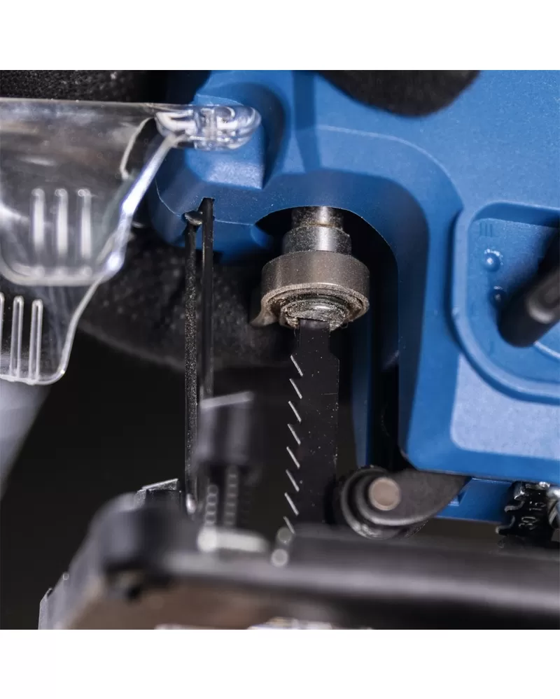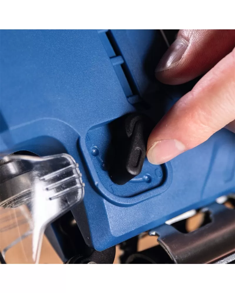 • Pila má snadné jednoruční ovládání, elektronické nastavení rychlosti, LED osvětlení pracovního prostoru a 3-stupňové nastavení předkmitu pro optimalizaci rychlosti řezání. Čistotě řezu napomáhá i integrovaná ochrana proti otřepům.