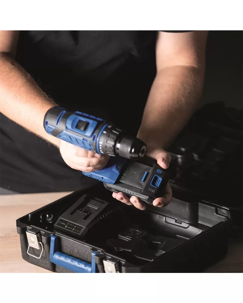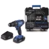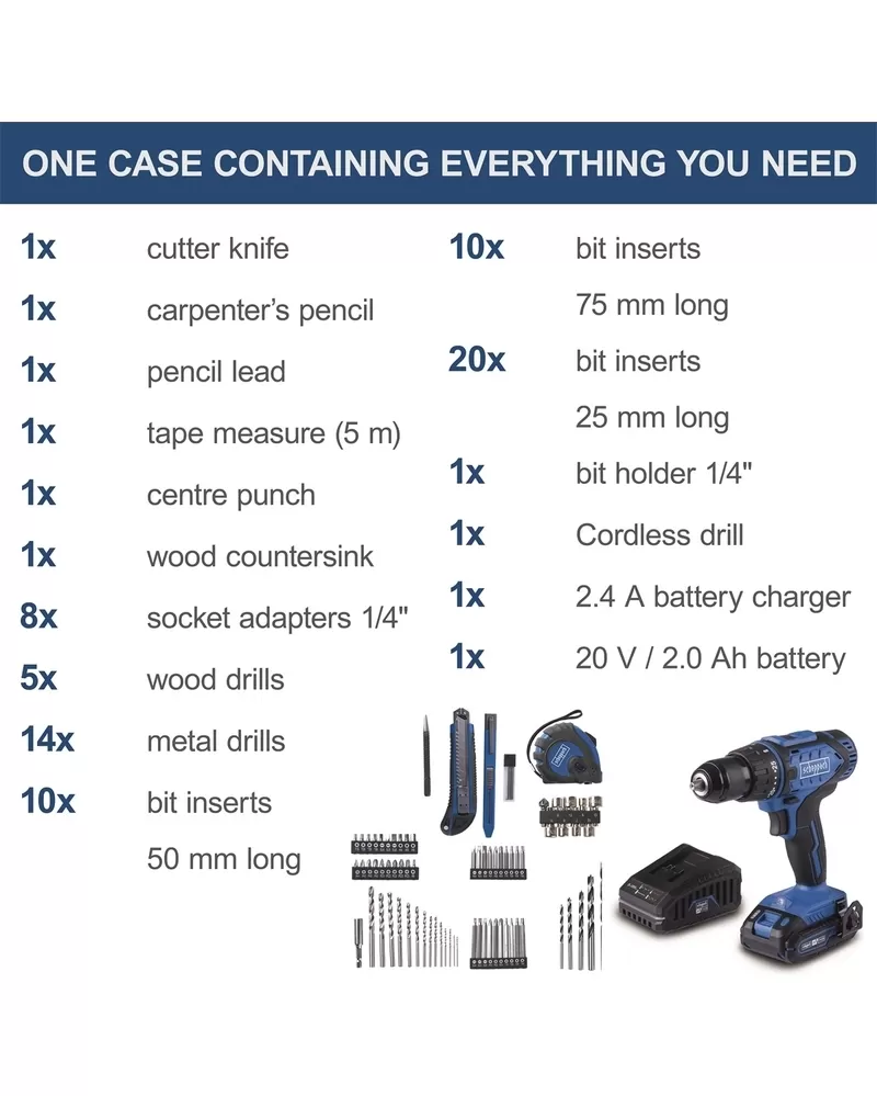 Set obsahuje výkonný akumulátorový vrtací šroubovák, nabíječku, baterii a 74dílnou sadu příslušenství, díky které zvládnete všechny práce doma, na zahradě, stavbě či na cestách.