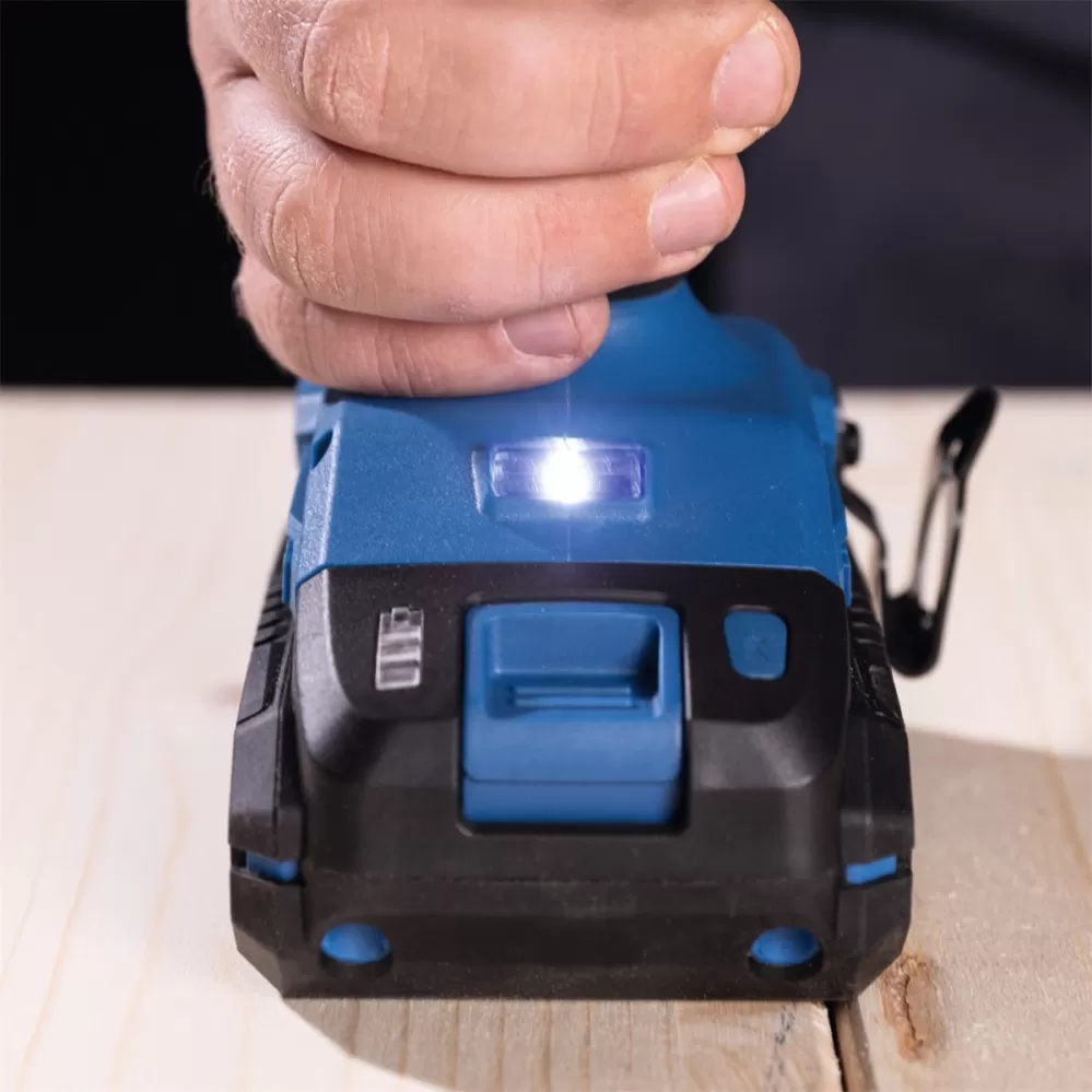 • Kvalitní rychloupínací kovové sklíčidlo s automatickým zámkem vřetene pojme vrtáky a bity o průměru 1,5–13 mm. Praktické LED pracovní světlo s funkcí osvětlení po dobu 10 sekund po vypnutí nástroje zajistí dostatek světla i v tmavých prostorech. Díky integrovanému klipu na opasek je vrtačka ideální i pro práci na žebříku nebo ve výškách.