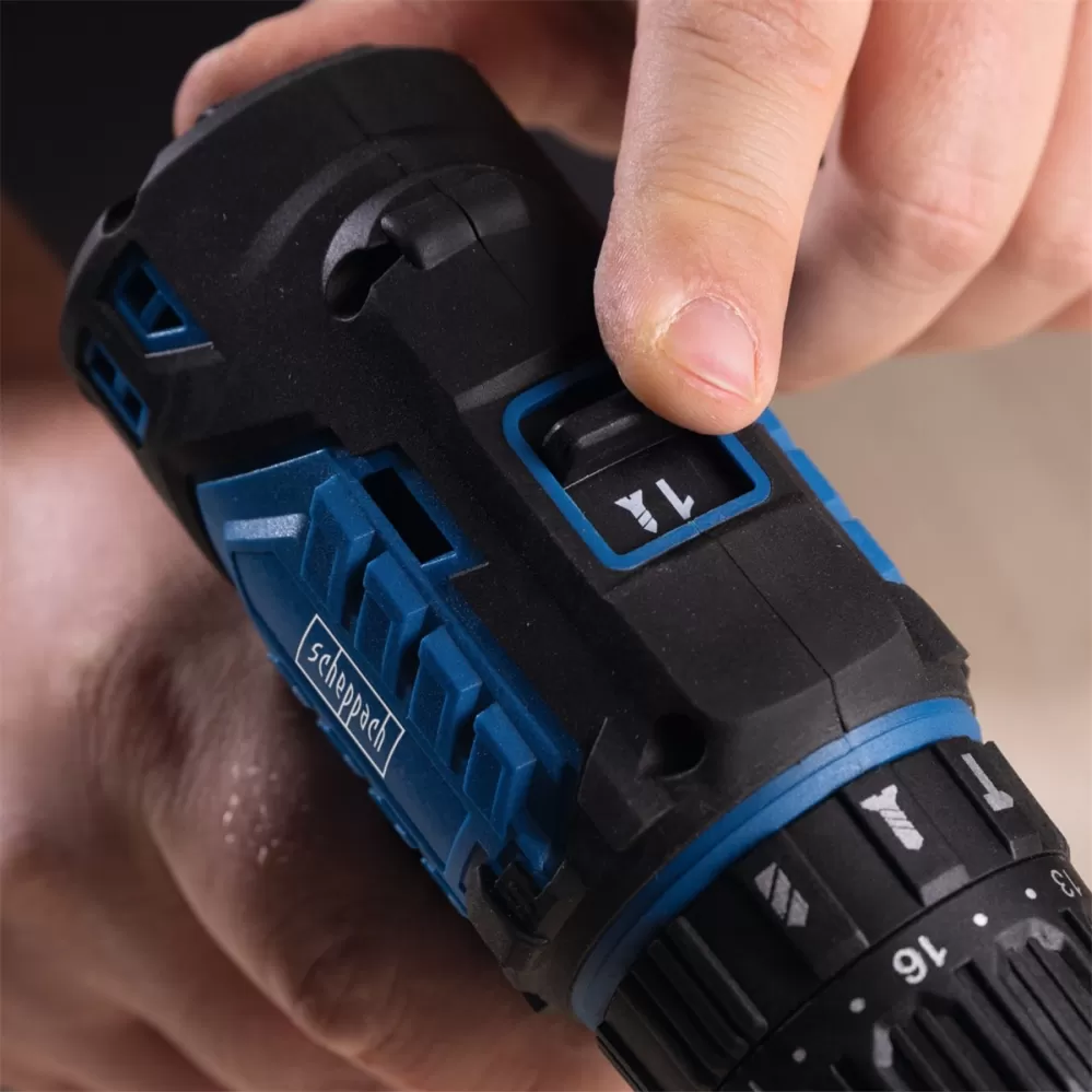 • K dispozici je 19 úrovní točivého momentu, 1 úroveň pro vrtání a 1 pro příklepové vrtání, což umožňuje přizpůsobit provoz konkrétním požadavkům a materiálům. Plynulou regulaci otáček zajišťuje pohodlný spínač a rychlé přepnutí mezi jednotlivými funkcemi provedete jednoduchým pootočením kruhového ovladače.