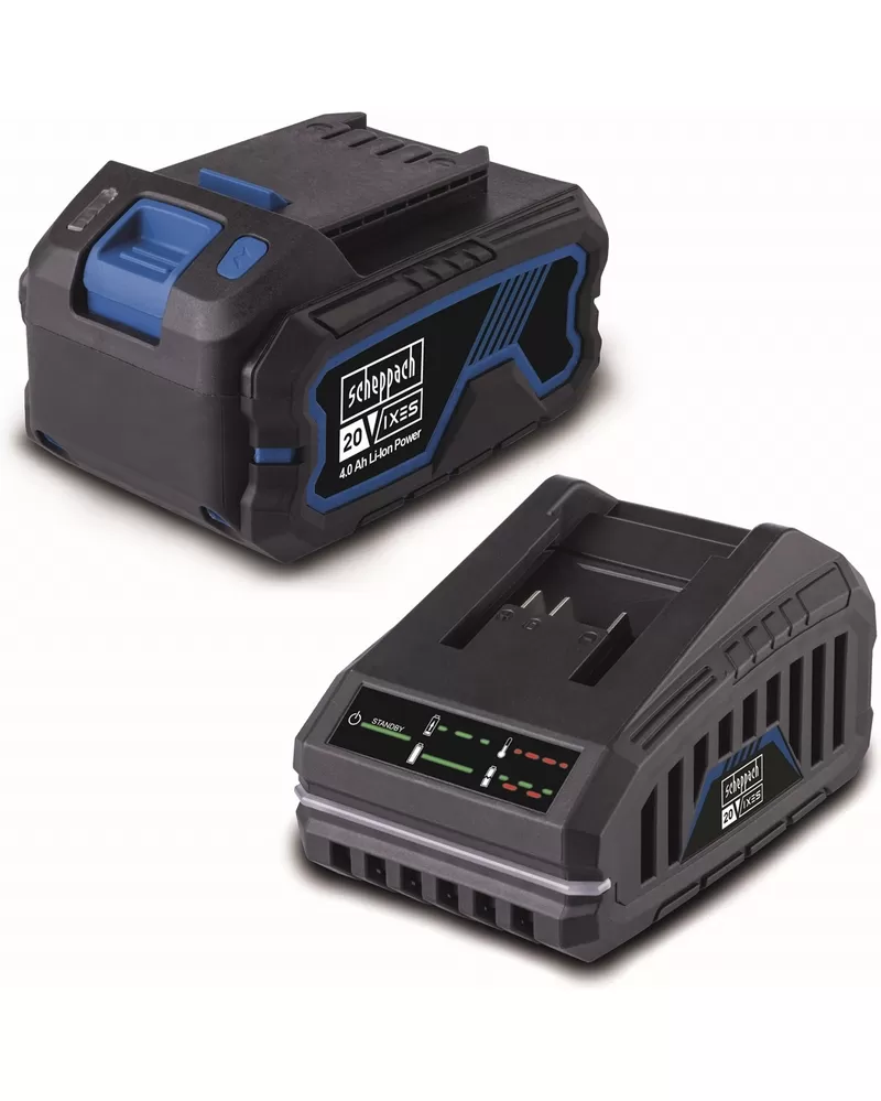 • Scheppach SBSK4.0 je akční startovací sada za výjimečně výhodnou cenu. Obsahuje rychlou nabíječku SBC2.4A a lithium-iontovou baterii SBP4.0 nabitou nejmodernějšími technologiemi s kapacitou 4 Ah. Tato univerzální sada může pohánět jakýkoliv stroj Scheppach z řady 20 V IXES.