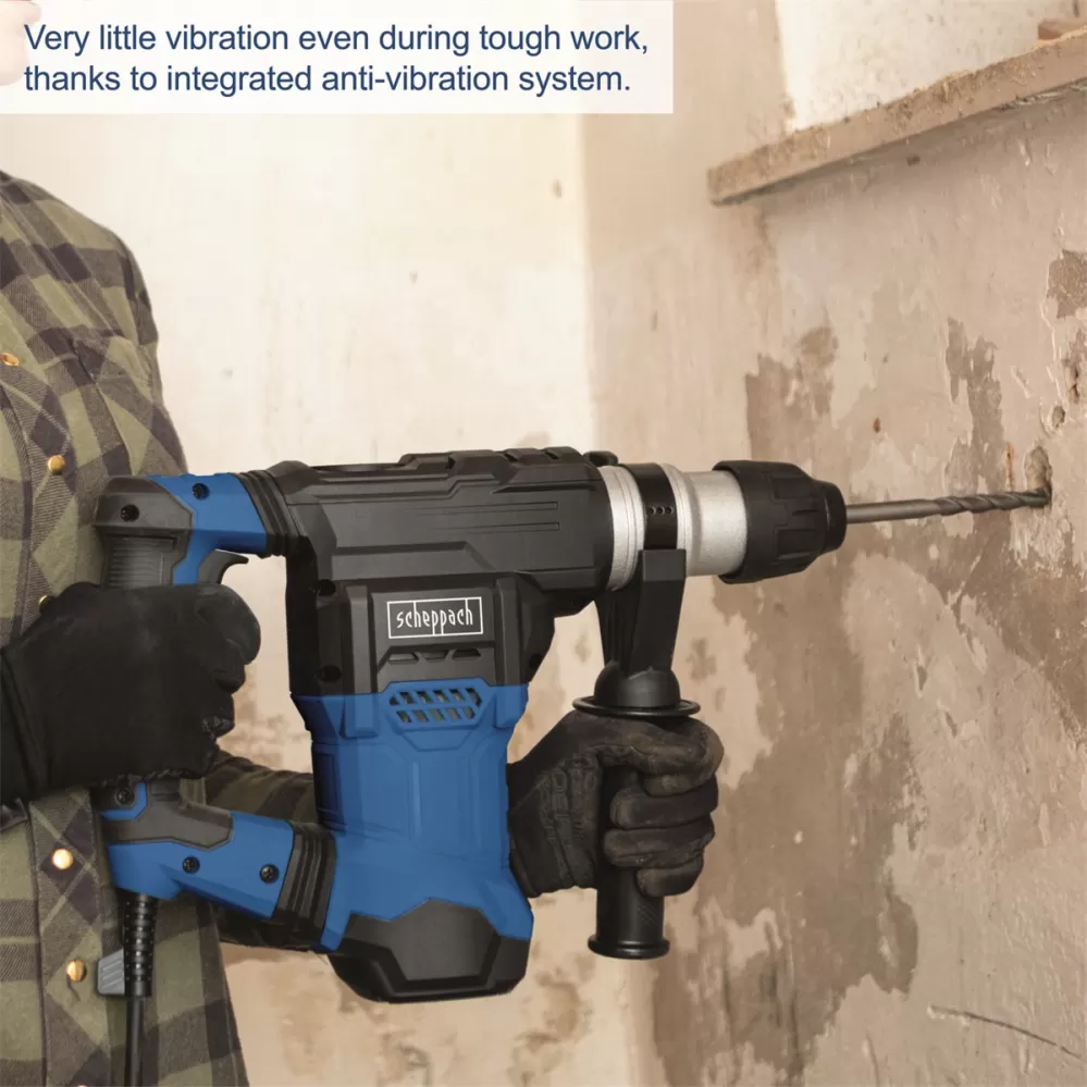 • Kompaktní a výkonné vrtací a sekací kladivo Scheppach DH 1500 PLUS je skvělým pomocníkem při všech běžných stavebních úkolech vyžadujících sekání či vrtání v měkkých i tvrdých materiálech. Kombinace silného motoru, nastavitelných otáček, síly úderu 7 joulů, vysoké frekvence úderů, spolehlivého systému uchycení SDS Plus a nízké hmotnosti dělá z tohoto kladiva univerzálního pomocníka při práci ve zdivu, betonu nebo dřevu. Kladivo je možno přepnout velkým otočným přepínačem do čtyř módů – vrtání (pro vrtání do dřeva, plastu nebo kovu), vrtání s příklepem (pro vrtání do betonu, cihel nebo zdiva), sekání (odstraňování dlaždic, čištění ploch od nálitků, sekání vedení pro kabely apod.) a nastavení polohy sekáče do požadované polohy. Aby byl komfort při práci co nejvyšší, je stroj vybaven nastavitelnou rukojetí, protiskluzovým držadlem a účinným antivibračním systémem. Upnutí systémem SDS Plus zajistí snadnou, rychlou a pohodlnou výměnu nástroje bez nutnosti použití nářadí. Kvalitní převodovka je uložena a chráněna v kovové skříni. Stroj se standardně dodává s pevným plastovým kufrem, přídavnou rukojetí, dvěma sekáči, třemi vrtáky, hloubkovým dorazem, přípravkem k odsávání prachu, sklíčidlem pro použití i běžných vrtáků, kličkou na sklíčidlo, mazivem a servisním klíčem.