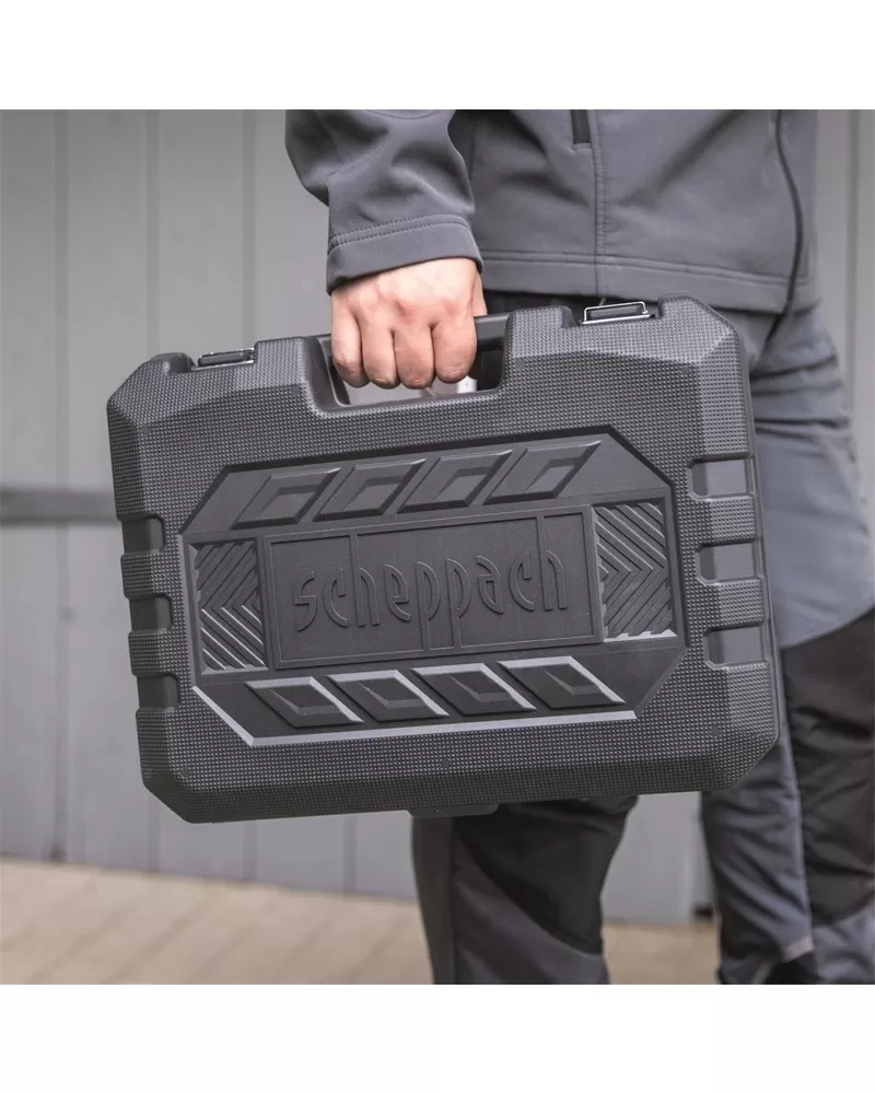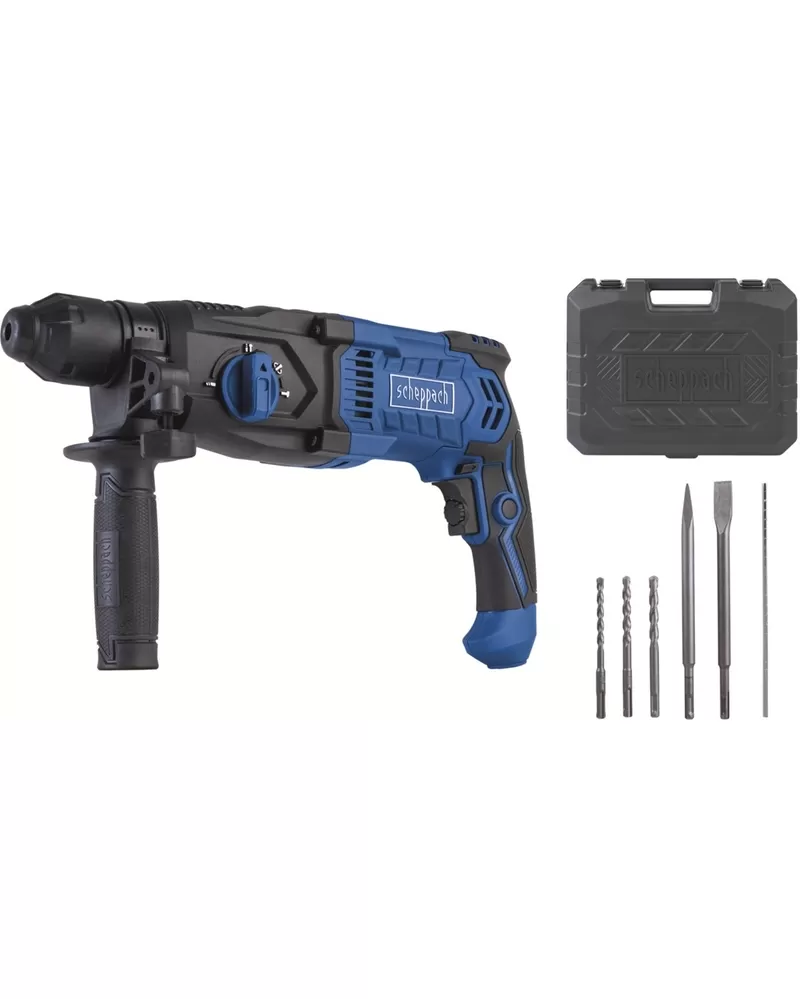 • Součástí balení je bohaté příslušenství, zahrnující špičatý a plochý sekáč (14 × 250 mm), vrtáky do zdiva o průměrech 6, 8 a 10 mm, hloubkový doraz a praktický transportní kufr, který usnadňuje skladování i přenášení.