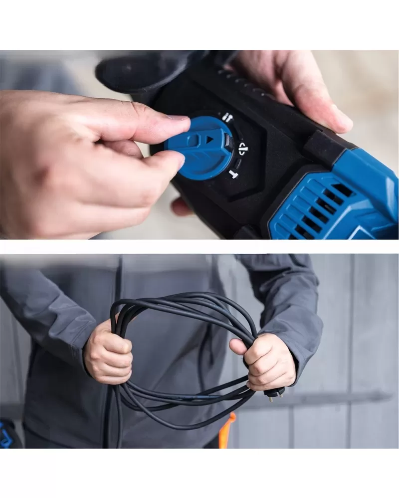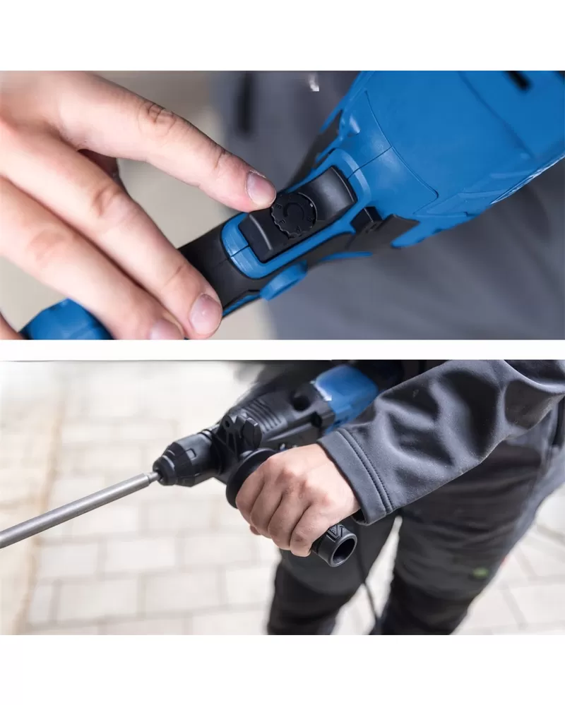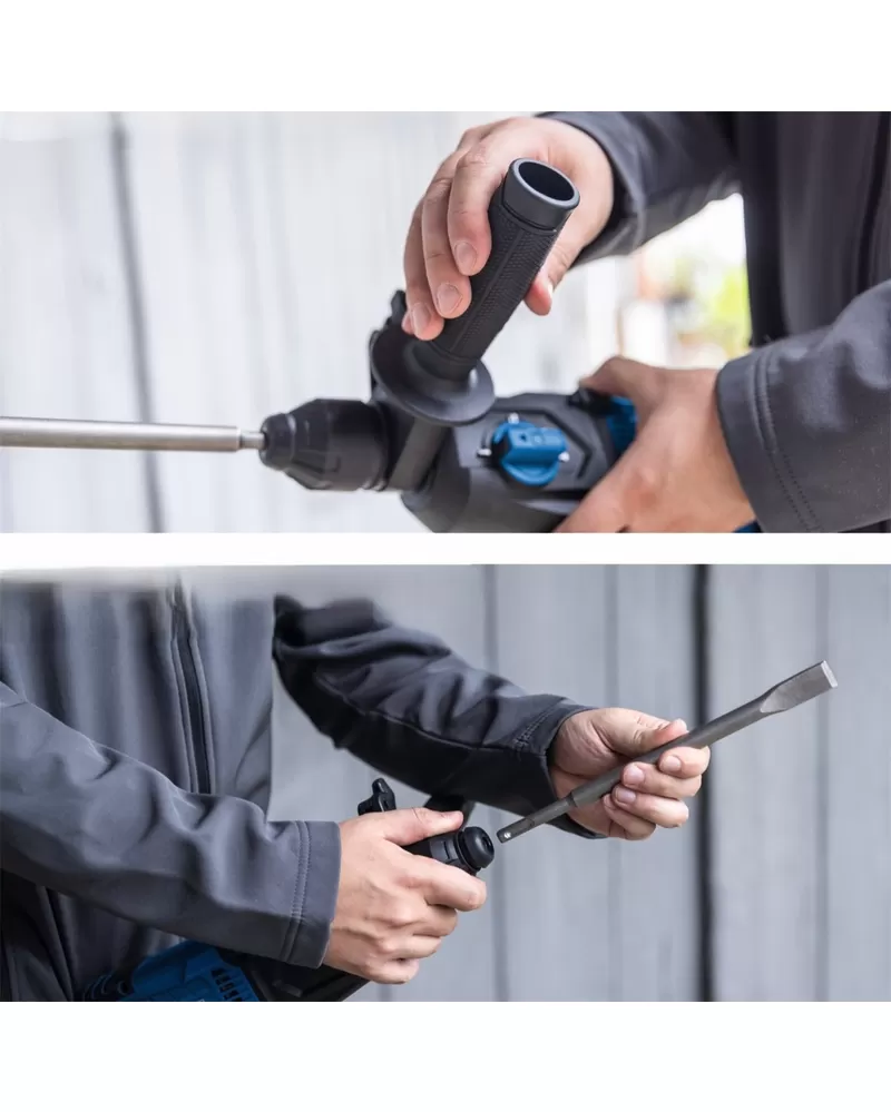• Pro maximální komfort a bezpečnost je kladivo vybaveno přídavnou rukojetí otočnou o 360°, která zajišťuje pevný a jistý úchop v jakékoli pracovní poloze. Ergonomický a kompaktní design s měkčeným povrchem rukojeti přispívá k pohodlné manipulaci i při delší práci. Upínací systém SDS-Plus umožňuje rychlou a snadnou výměnu vrtáků a sekáčů bez zbytečných prostojů.