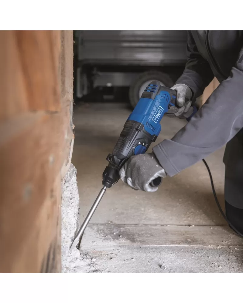 • Lehké a výkonné elektrické kombinované kladivo s energií úderu 3 J je všestranným pomocníkem pro širokou škálu prací v dílně i na stavbě. Díky praktické funkci 4 v 1 umožňuje klasické vrtání, vrtání s příklepem, sekání i nastavení polohy sekáče, takže se snadno přizpůsobí konkrétnímu úkolu. Vysoký počet až 5 500 příklepů za minutu zaručuje efektivní práci i v tvrdých materiálech, jako je beton nebo zdivo.
