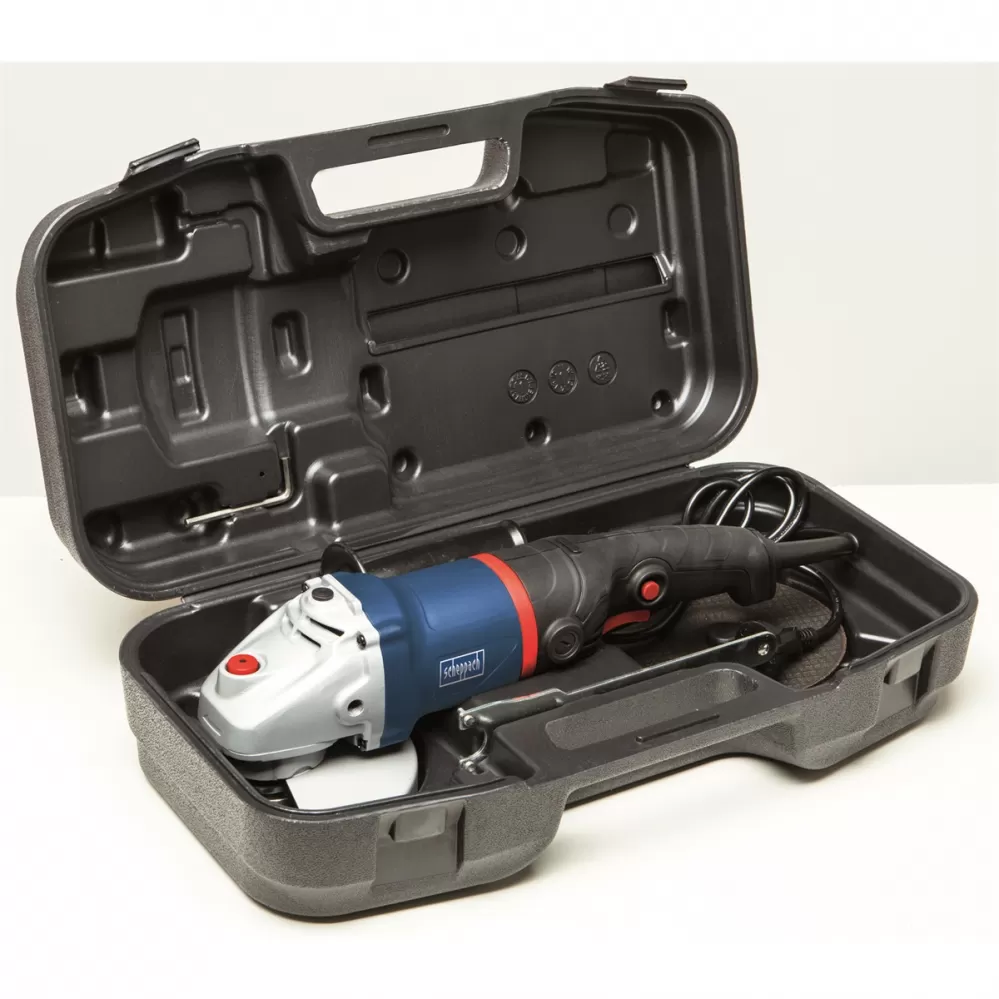 1x brusný kotouč, postranní rukojeť, ochranný kryt, klíč, plastový kufr, Elektrické ruční nářadí Scheppach