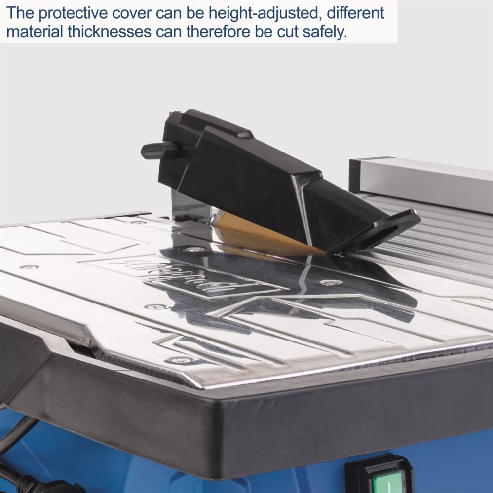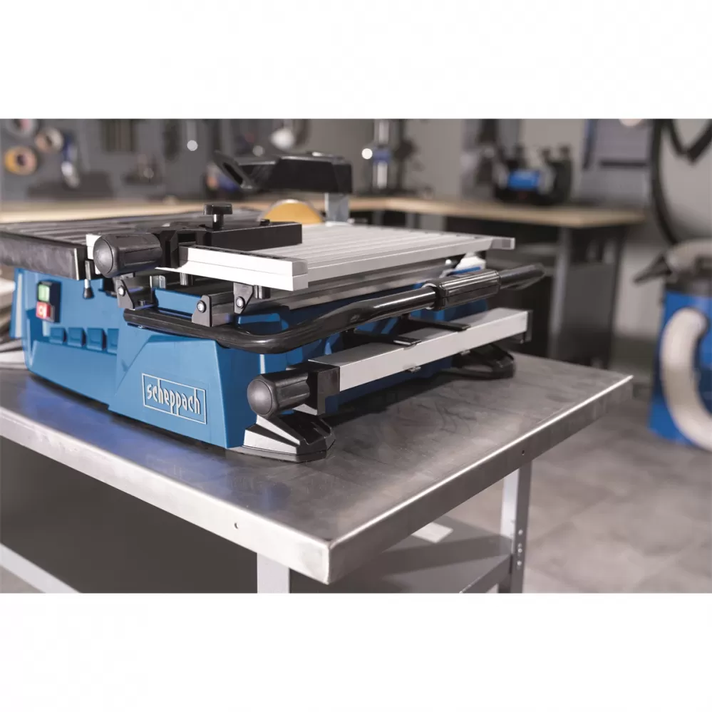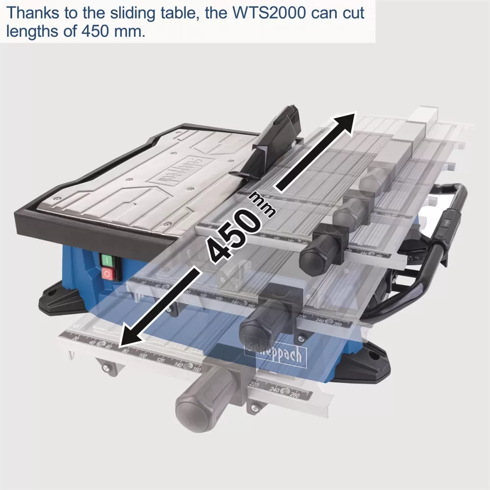 Moderní řezačka na dlažbu Scheppach WTS 2000 je výborným pomocníkem všech řemeslníků nebo kutilů pracujících často s obklady či dlažbou a je pro ně důležitá mobilita nebo potřeba kompaktního a lehkého stroje. Zásadní výhodou je koncepce s posuvným stolkem, díky čemuž nejsou problémy řezy o délce až 450 mm a výšce 32 mm. Stolek s přesnou milimetrovou stupnicí obsahuje i úhlové pravítko s integrovanou stupnicí pro řezání pod úhly a rovněž praktický posuvný boční doraz. Prémiový diamantový kotouč je, na rozdíl od běžných konstrukcí, pevně usazen, takže dlouhé řezy jsou velice přesné. Podle tloušťky materiálu jde výškově nastavit rovněž kryt kotouče. Silný motor 900 W s tepelnou ochranou si hravě poradí s řezáním dlažby, obkladaček, mramoru apod. Robustní podstavec obsahuje jímku na vodu pro chlazení kotouče a bezprašnou práci, integrovanou rukojeť s gumovým madlem, držáky na boční doraz a úhlové pravítko pro ochranu při transportu, gumové nožičky a otvory pro přidělání k pracovní desce. Stroj je vybaven nejmodernější bezpečnostní ochranou a je certifikovaný německou společností TÜV i pro dlouhodobé používání.