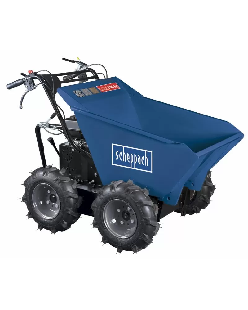 Kolový přepravník Scheppach DP 3000 Vám umožní velmi pohodlnou přepravu až 300 kg sypkých i pevných materiálů i na velmi špatně přístupných místech. Skvěle se hodí na přepravu zeminy, písku, štěrku, kamenů, dlažby, cihel, ale třeba i dřeva nebo trávy. Hojně se využívá na staveništích, při demolicích či rekonstrukcích objektů, při výkopových pracích, v zemědělství, zahradnictví, lesnictví ap. Výhodou je nejenom větší bezpečnost a průchodnost i v těžším terénu, ale i výrazně vyšší produktivita práce oproti běžným manuálním přepravním prostředkům. Pohon všech čtyř kol zaručuje skvělou průchodnost i velkou svahovou dostupnost, přičemž velká a široká kola přispívají ke snadné ovladatelnosti a ochraně podkladu. Obsluha všech ovládacích prvků je velmi jednoduchá. Páčkami na rukojeti snadno řídíte otáčení, brzda se aktivuje automaticky při uvolnění páky spojky a rovněž páka řazení třístupňové převodovky je ve snadném dosahu obsluhy. Pro pohon je použit velmi oblíbený motor Loncin s vysokým výkonem 6,5 HP, který patří k nejoblíbenějším a nejspolehlivějším pohonným jednotkám vůbec. Stroj lze dovybavit sněhovou radlicí o rozměrech 100 x 50 cm.
