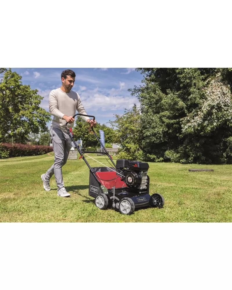 • Nastavení hloubky vertikutace se děje snadno pomocí jedné páky, 4 velká kola umožní hladký pohyb i po nerovném terénu, výkonný motor si poradí i s dlouho neudržovaným trávníkem a široký výhozový otvor dovolí snadný výhoz trávy ven nebo do objemného koše